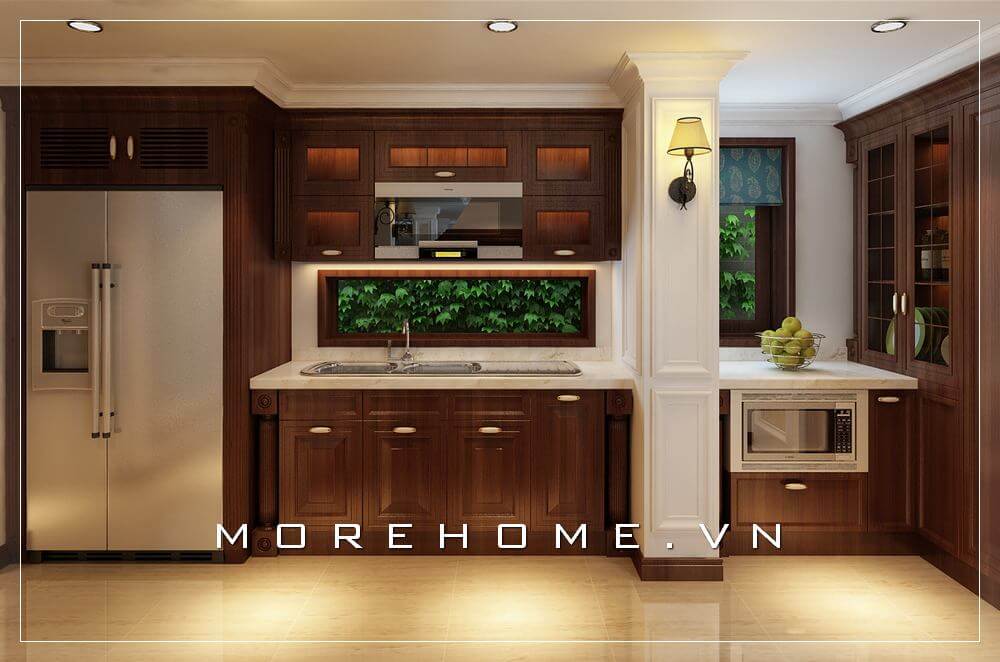 Mẫu tủ bếp gỗ tự nhiên tone màu trầm, thiết bị phòng bếp hiện đại tạo không gian ấm cúng và tiện nghi cho người nội trợ