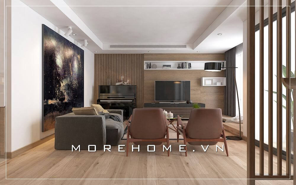 Thiết kế nội thất phòng khách có đàn piano ấn tượng với cách trang trí mộc mạc từ chất liệu gỗ nhưng phá cách với bức tranh treo tường sống động trong không gian căn hộ chung cư.