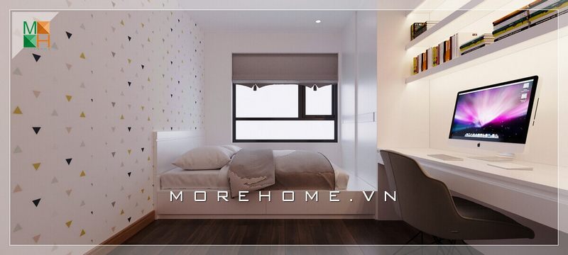 Mẫu thiết kế bàn học và kệ sách treo tường giúp tiết kiệm diện tích phòng ngủ giúp căn phòng ngủ trở nên gọn gàng và tiện nghi hơn.