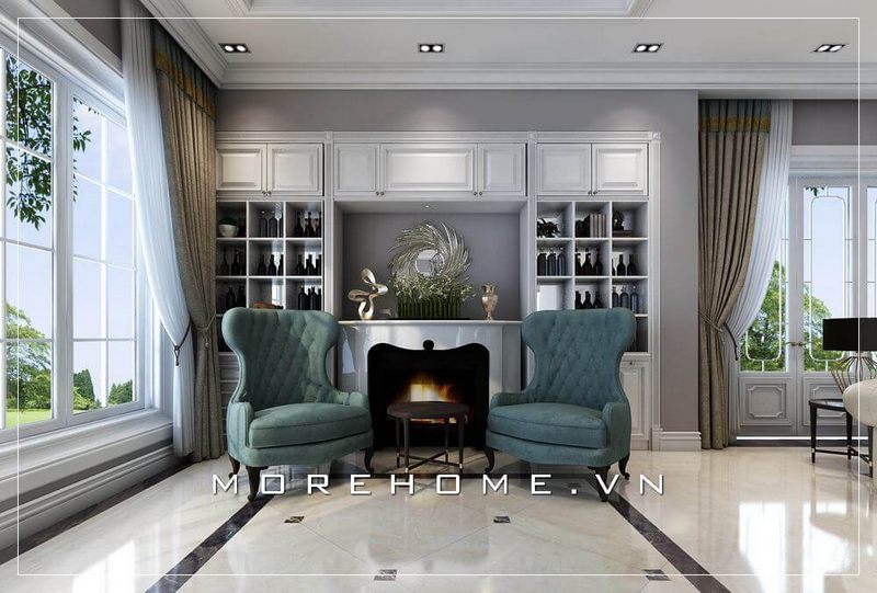 Sự kết hợp ấn tượng giữa thiết kế sofa tân cổ điển dáng văng tiện lợi với sofa đơn màu xanh độc đáo cho phòng khách biệt thự, nhà phố thêm ấn tượng.