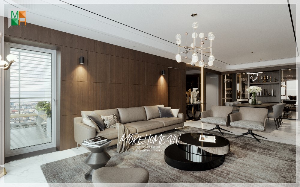 Với phong cách thiết kế hiện đại, không gian phòng khách mang gam màu chủ đạo trung tính. Gam màu mang đến sự ấm áp, sang trọng cho khu vực phòng khách.