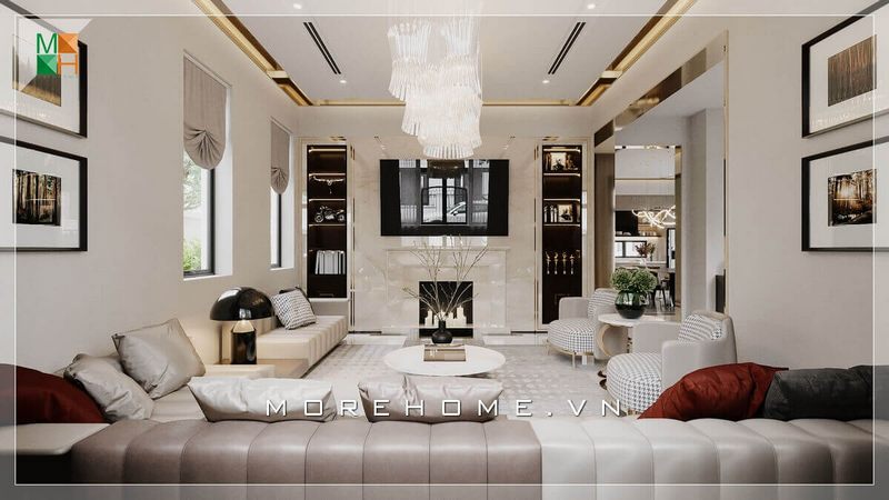 Phòng khách biệt thự theo phong cách tân cổ điển sự dụng hoa văn tròn làm điểm nhấn