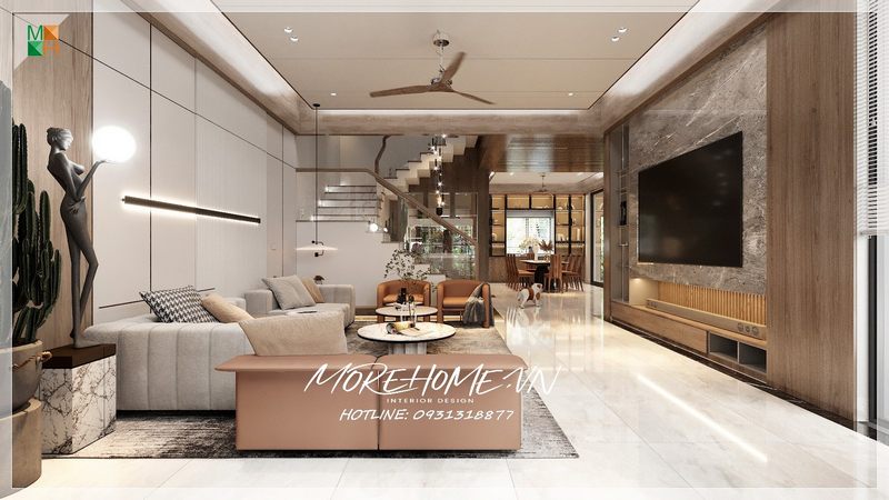 Phòng khách và phòng ăn được thiết kế theo phong cách hiện đại cao cấp, kết hợp với tông màu sáng nên tạo nên sự ấn tượng và nổi bật hơn.