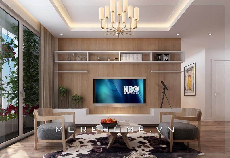 Việc bố trí nội thất phòng khách của chung cư hiện đại để tạo nên sự độc đáo là bằng cách sử dụng gỗ ốp tường để trang trí.
