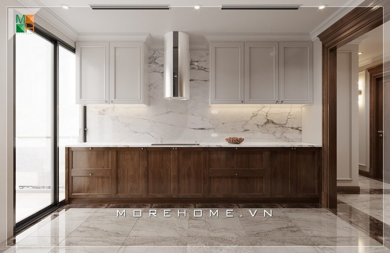 Sự kết hợp giữa những chi tiết gỗ tự nhiên cao cấp và thiết kế nội thất phòng bếp biệt thự sẽ tạo nên một cảm giác ấm cúng, sang trọng và tiện nghi.