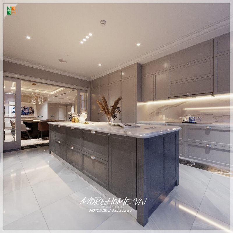 Mẫu thiết kế phòng bếp chung cư hiện đại với tông màu ghi xám chủ đạo đã đảm bảo được sự thẩm mỹ, hiện đại cũng như giữ nguyên được ngôn ngữ thiết kế sang trọng và đơn giản của tổng thể thiết kế căn nhà.
