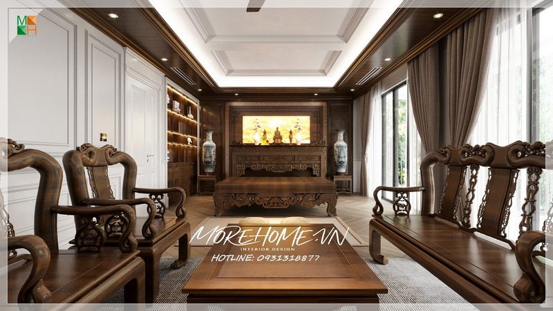 Áp dụng thiết kế gỗ óc chó cho không gian phòng khách biệt thự sẽ tạo nên vẻ đẹp sang trọng và đẳng cấp cho gia đình.