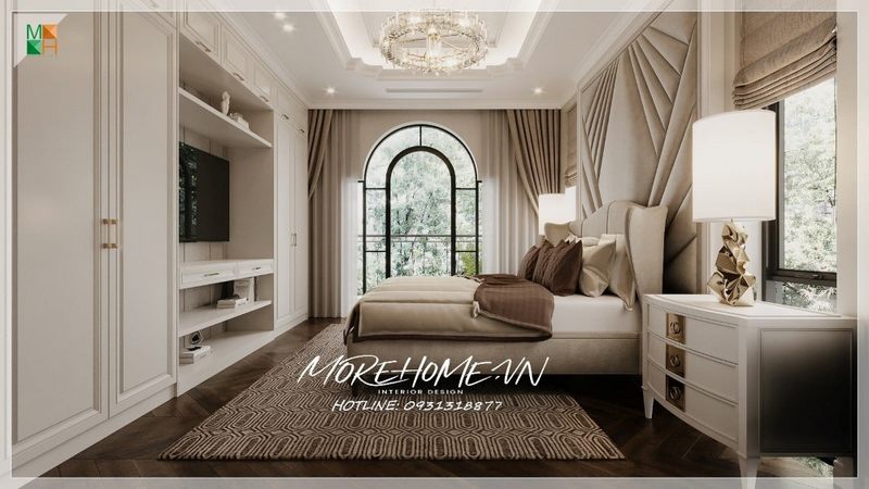 Mẫu thiết kế phòng ngủ master với nội thất gỗ tự nhiên sơn trắng để tạo ra sự sang trọng cho các căn hộ, nhà phố, biệt thự tân cổ điển.