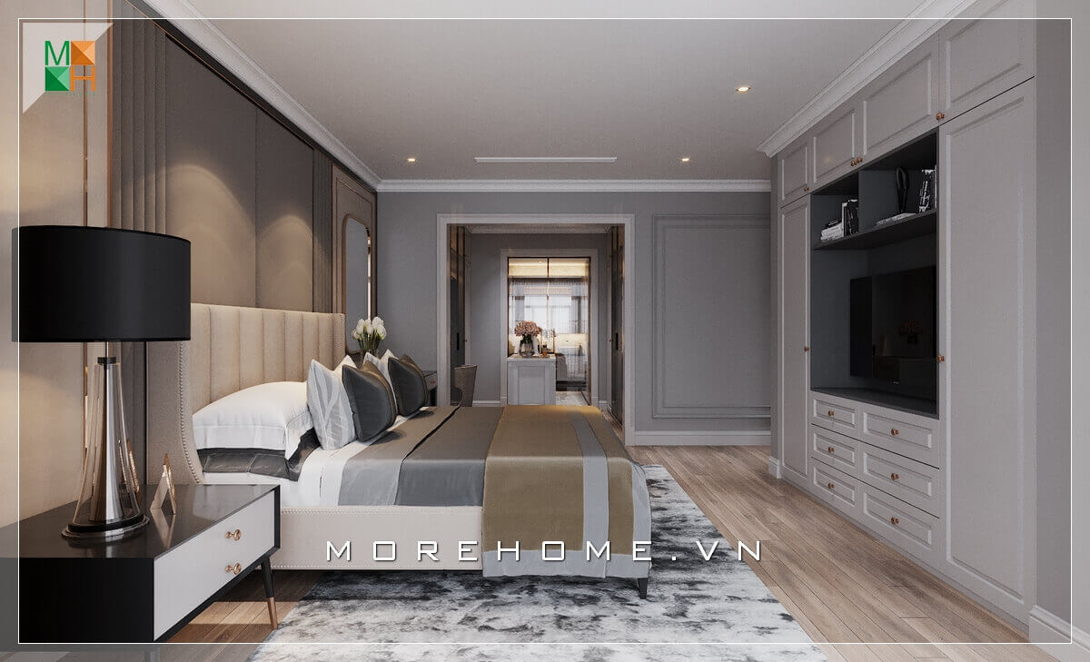 Thiết kế phòng ngủ chung cư mang phòng cách tân cổ điển, màu sắc hài hòa giữa trắng và xám khiến căn phòng trở nên sang trọng và tôn vẻ sang trọng hơn.